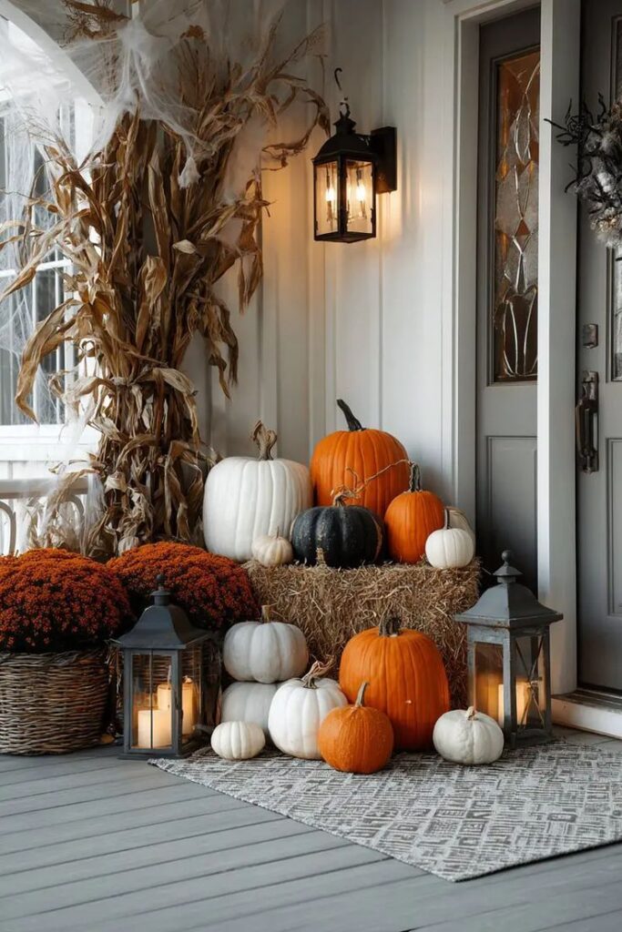 Start with the pathway. Carved pumpkins, lanterns, or LED jack-o’-lanterns lining the walkway guide visitors to your door while creating a festive glow. Adding cobwebs across bushes or porch railings, with a few plastic spiders, gives the entrance an eerie texture.